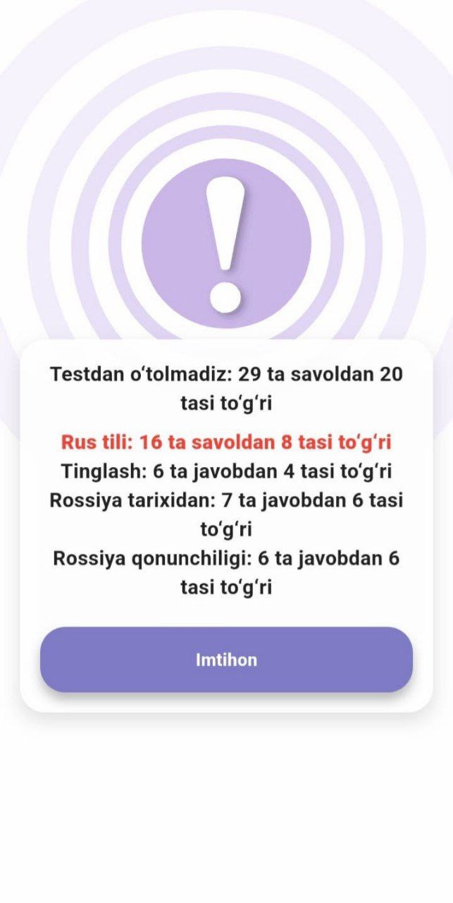 ✓ РВП imtihonining test qismidagi 319 ta savolga javoblarni yodlash qiyinmi? Sun’iy intellektli mobil ilovada imtihonga tayyorlanishni harakat ko‘ring!